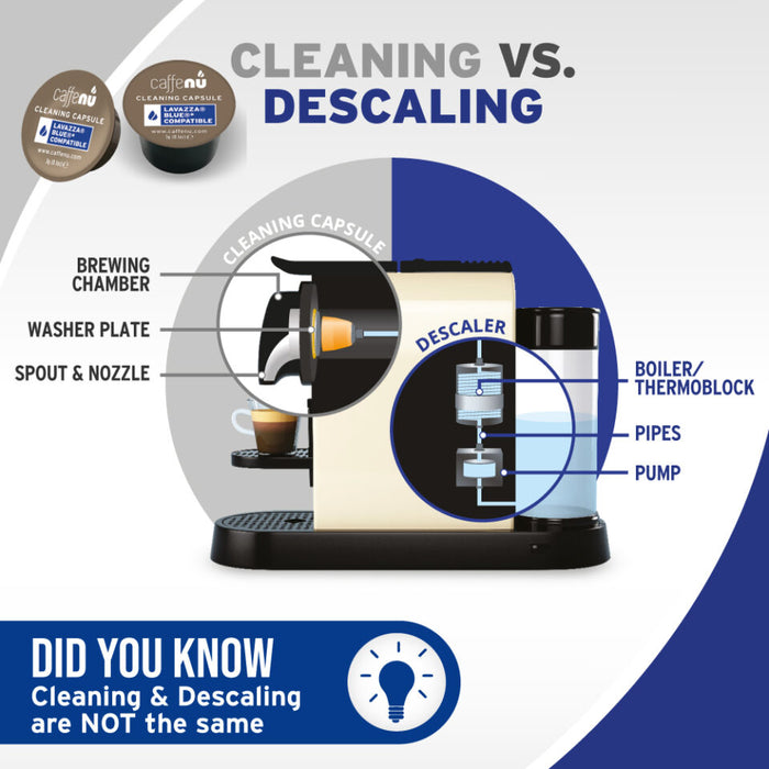 Clean your Lavazza® Blue® coffee machine with ease using Caffenu® Cleaning Capsules. These eco-friendly capsules use powerful foaming action to remove coffee residue, oils, and bacteria from inside the machine—places even descalers can’t reach.